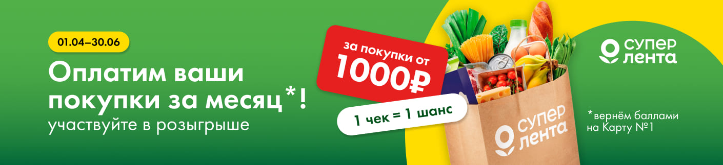 Период проведения: с 01.04.2026 по 30.06.2026 включительно. В акции могут участвовать держатели Карты №1, совершающие покупки от 1000 рублей одним чеком в магазинах «Супер Лента». Не участвует доставка и самовывоз. Каждый чек на сумму от 1000 рублей даёт 1 шанс на победу в ежемесячном розыгрыше. Каждый меяц с помощью генератора случайных чисел определяется 1 победитель, который получает компенсацию стоимости подтверждённых покупок в «Супер Ленте» за соответствующий месяц, но не более 30 000 (тридцати тысяч) рублей, в виде бонусных баллов на Карту лояльности. Баллы начисляются в течение 10 рабочих дней после определения победителя, ими можно оплатить до 100% следующих покупок в течение 3 календарных месяцев с момента начисления, 1 балл = 1 рубль. Подробности на lenta.com или по тел. 8–800–700–41–11 (звонок по России бесплатный). *№1 по количеству покупателей считающих, что программа лояльности по Карте №1 дает существенную экономию (опрос покупателей Ленты 2025).