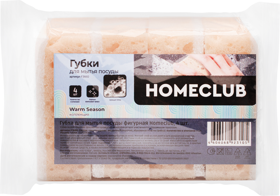 Полное название товара Губка для мытья посуды HOMECLUB фигурная, Арт. F3660, 4шт