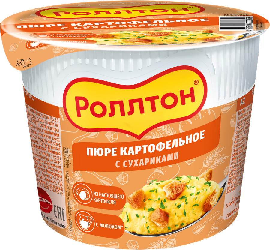 Хлопья картофельные (картофель (99%), стабилизаторы (Е450i, Е450iii), антиокислители (аскорбиновая и лимонная кислоты, Е223, Е304i),краситель (куркумин)), заменитель сухих сливок на растительной основе (глюкозный сироп, масло растительное, стабилизаторы (Е340,Е452), молочный белок), сухарики обжаренные (мука пшеничная высшего сорта, масло растительное, соль, дрожжи, антиокислитель(экстракт розмарина)), соль, сухое обезжиренное молоко, лук репчатый жареный (лук, масло растительное, мука пшеничная высшегосорта), усилители вкуса и аромата (Е621, Е635), сахар, зелень петрушки сушеная, ароматизатор, куркума.