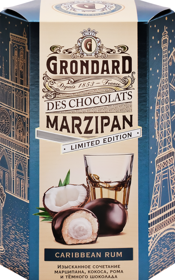 Марципан (сахар, миндаль (33%), глюкозно-фруктозный сироп, агент влагоудерживающий (сорбит), этиловый спирт, консервант (сорбаткалия), регулятор кислотности (лимонная кислота), ром, ароматизатор), темный шоколад (сахар, какао-тертое, какао-масло, эмульгаторы(соевый лецитин, Е476), ароматизатор ванилин), м. д. общего остатка какао не менее 40%, кокосовая начинка (сахар, растительныемасла и жиры, кокосовая стружка, сухое обезжиренное молоко, сухая молочная сыворотка, масло какао, эмульгаторы (соевый лецитин),ароматизатор).